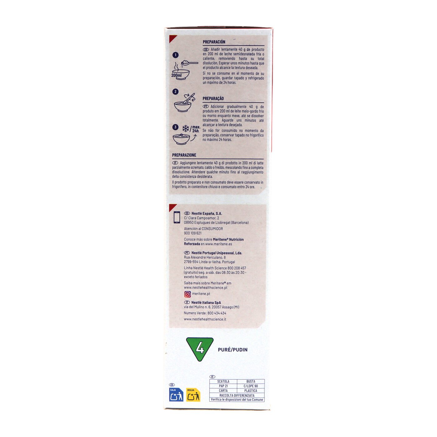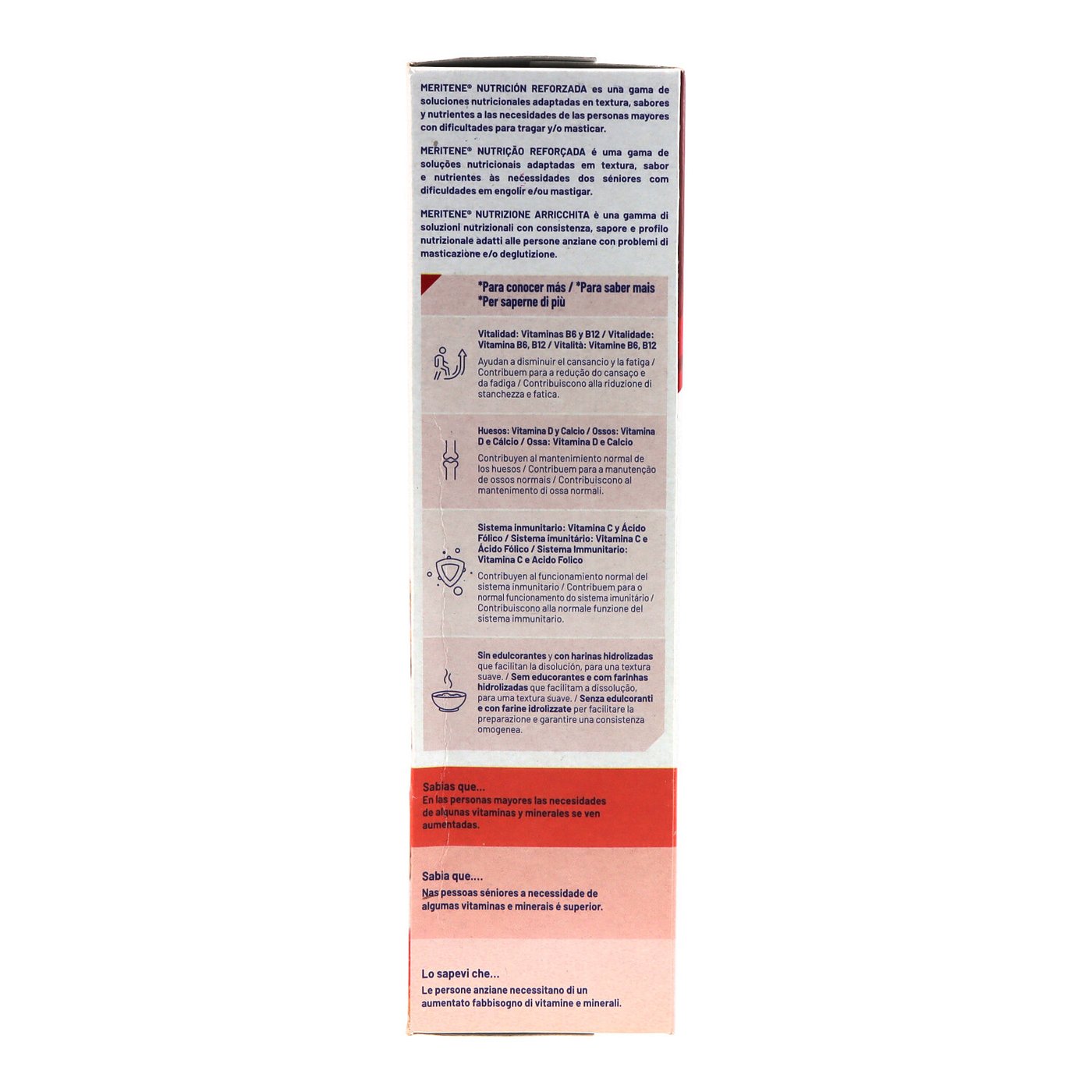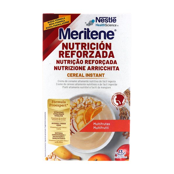 Meritene Reinforced Nutrition Instant Multifruit Cereal 520g: creme de cereais enriquecido com vitaminas e minerais, desenvolvido para pessoas com dificuldades de mastigação ou deglutição.