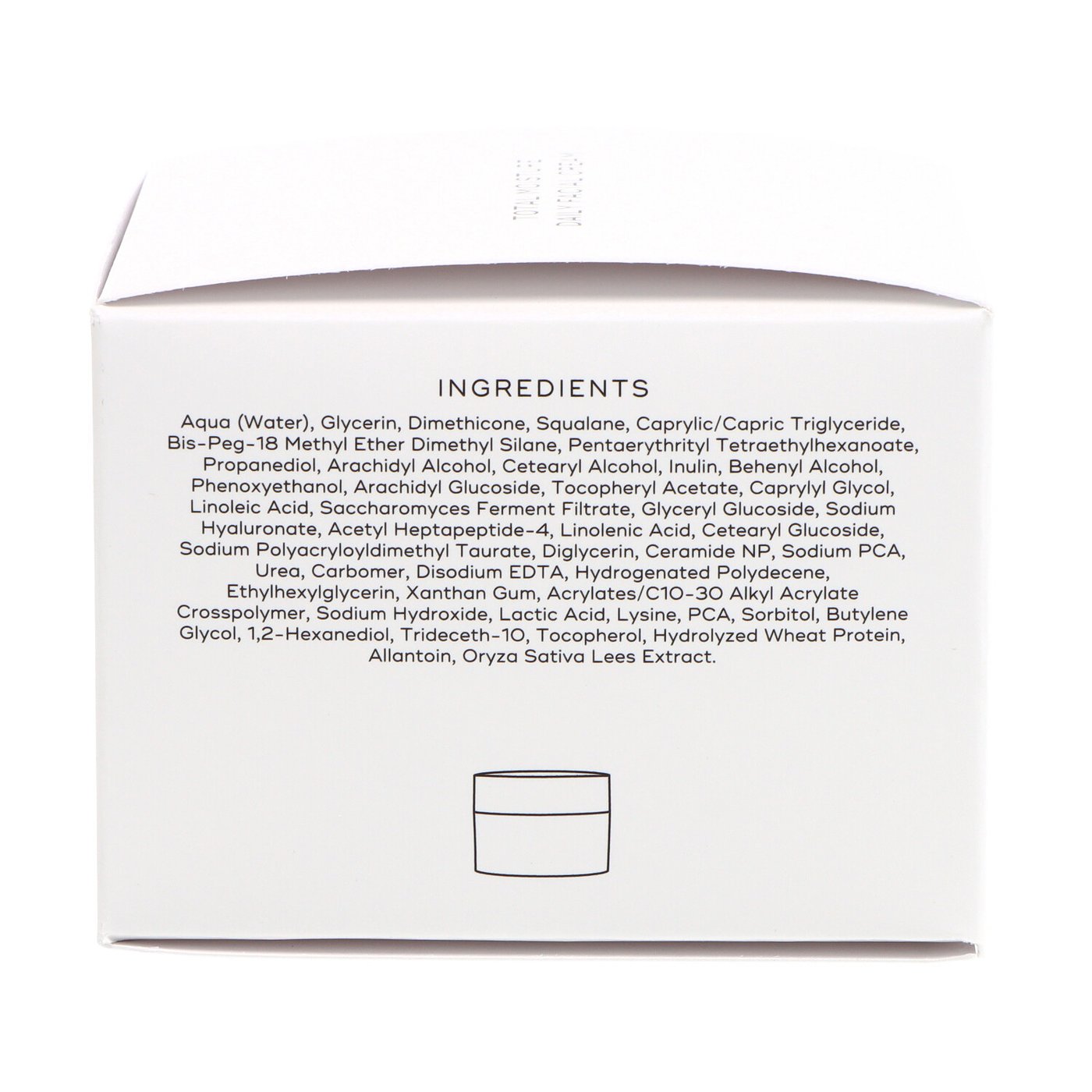 Água, Glicerina, Dimeticona, Esqualano, Triglicerídeo Caprílico/Cáprico, Éter Metílico Bis-PEG-18 Dimetil Silano, Tetraetilhexanoato de Pentaeritritil, Propanodiol, Álcool Araquidílico, Álcool Cetearílico, Inulina, Álcool Behenílico, Fenoxietanol, Glicosídeo de Araquidil, Acetato de Tocoferila, Caprililglicol, Ácido Linoleico, Filtrado de Fermento de Saccharomyces, Glicosídeo de Glicerila, Hialuronato de Sódio, Acetil Heptapeptídeo-4, Ácido Linolênico, Glicosídeo de Cetearil, Taurato de Poliacriloildimetil Sódio, Diglicerina, Ceramida NP, PCA Sódico, Ureia, Carbômero, EDTA Dissódico, Polideceno Hidrogenado, Etilhexilglicerina, Goma Xantana, Acrilatos/Acrilato de Alquila C10-30 Polímero cruzado, hidróxido de sódio, ácido láctico, lisina, PCA, sorbitol, butilenoglicol, 1,2-hexanodiol, trideceth-10, tocoferol, proteína de trigo hidrolisada, alantoína, extrato de borras de Oryza sativa.