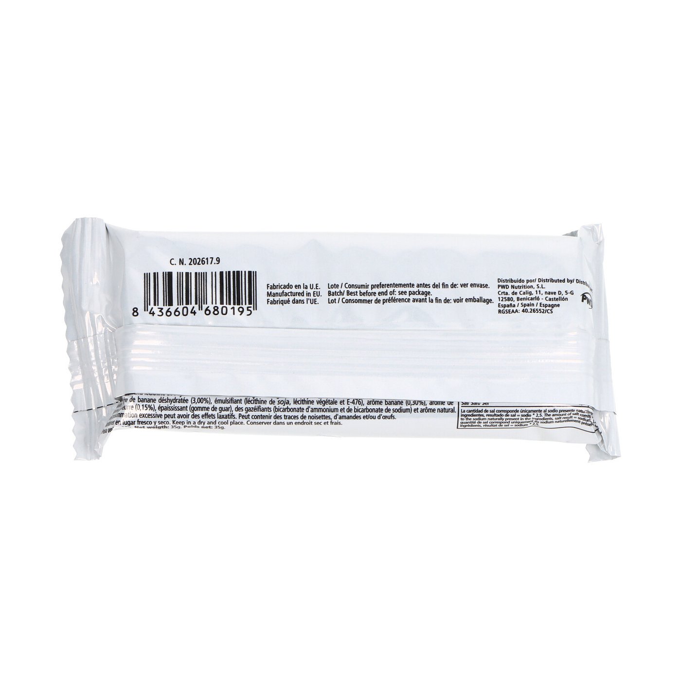 Mistura de proteína do leite, cobertura de chocolate ao leite (25,71%) (açúcar, manteiga de cacau, leite em pó desnatado, massa de cacau, soro de leite, manteiga anidra, emulsificante (lecitina de soja), aroma natural de baunilha, aromatizantes), farinha de trigo, gordura de palma não hidrogenada, açúcar, manteiga de cacau, banana em pó desidratada (3%), frutose, leite em pó desnatado, aromatizante de caramelo (0,15%), emulsificante (lecitina de soja e E-476), aromatizantes, espessante (goma guar), fermentos químicos (bicarbonato de amônio e bicarbonato de sódio) e adoçante (sucralose).