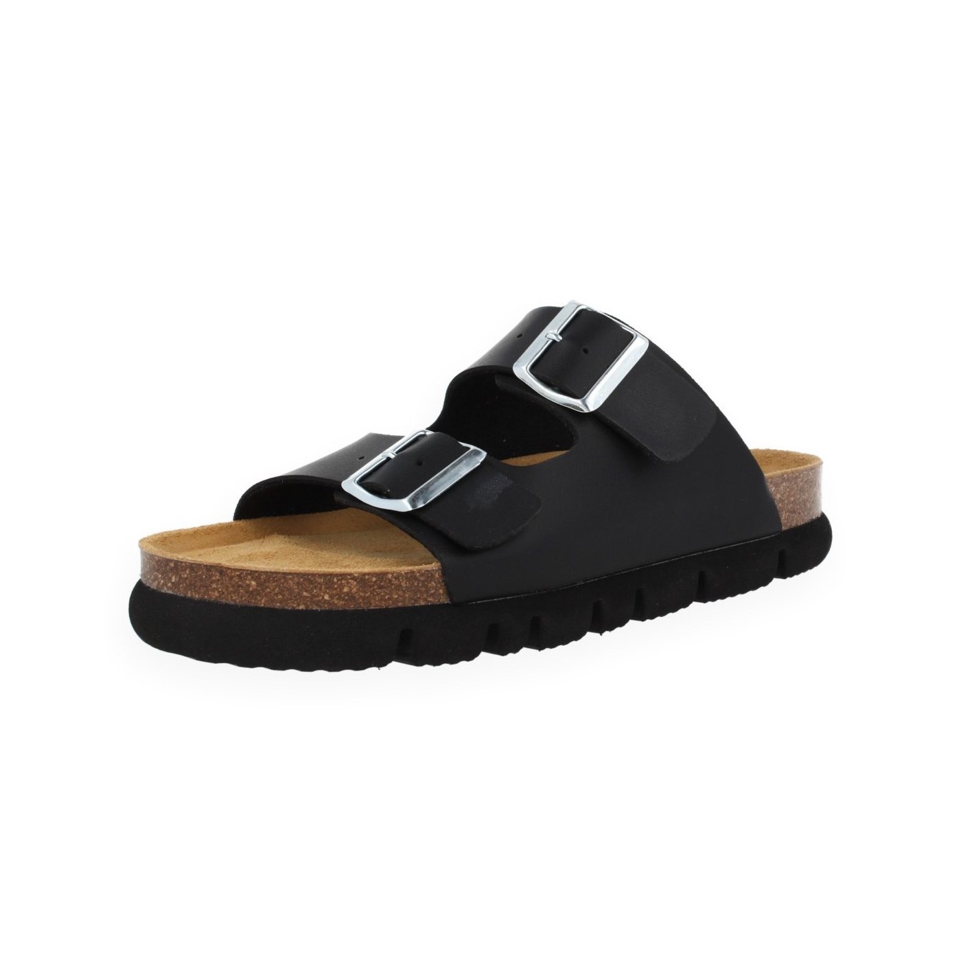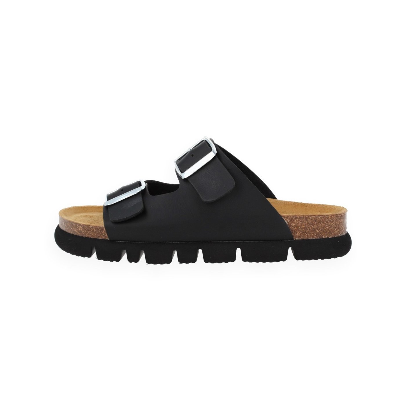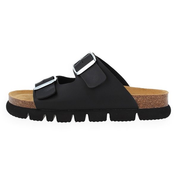 Sandália ortopédica preta de tira dupla, palmilha anatomicamente acolchoada e solado leve de cortiça. Projetado para oferecer conforto, respirabilidade e um ajuste personalizado a cada passo.