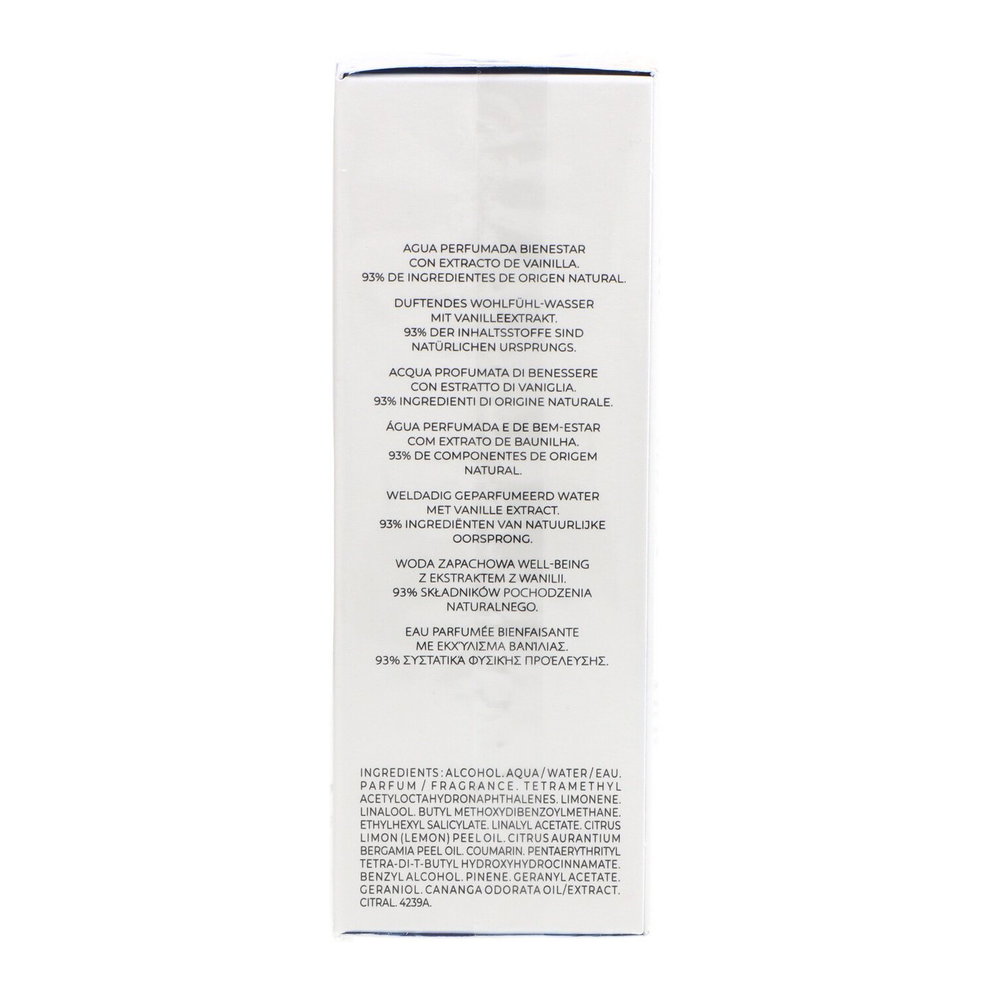 Álcool, Água, Perfume (Fragrância), Tetrametil Acetiloctahidronaftalenos, Limoneno, Linalol, Butil Metoxidibenzoilmetano, Salicilato de Etilhexila, Acetato de Linalila, Óleo da Casca de Citrus Limon (Limão), Óleo da Casca de Citrus Aurantium Bergamia (Bergamota), Cumarina, Pentaeritritil Tetra-di-t-butil Hidroxi-hidrocinamato, Álcool Benzílico, Pineno, Acetato de Geranila, Geraniol, Óleo/Extrato de Cananga Odorata (Ylang-Ylang), Citral.