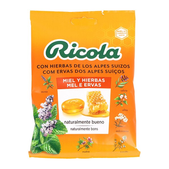 Balas de Mel e Ervas Ricola, pacote de 70g com mel natural e uma mistura de 13 ervas suíças, alívio calmante para a garganta, sem lactose e sem glúten, com sabor adocicado e frescor herbal.