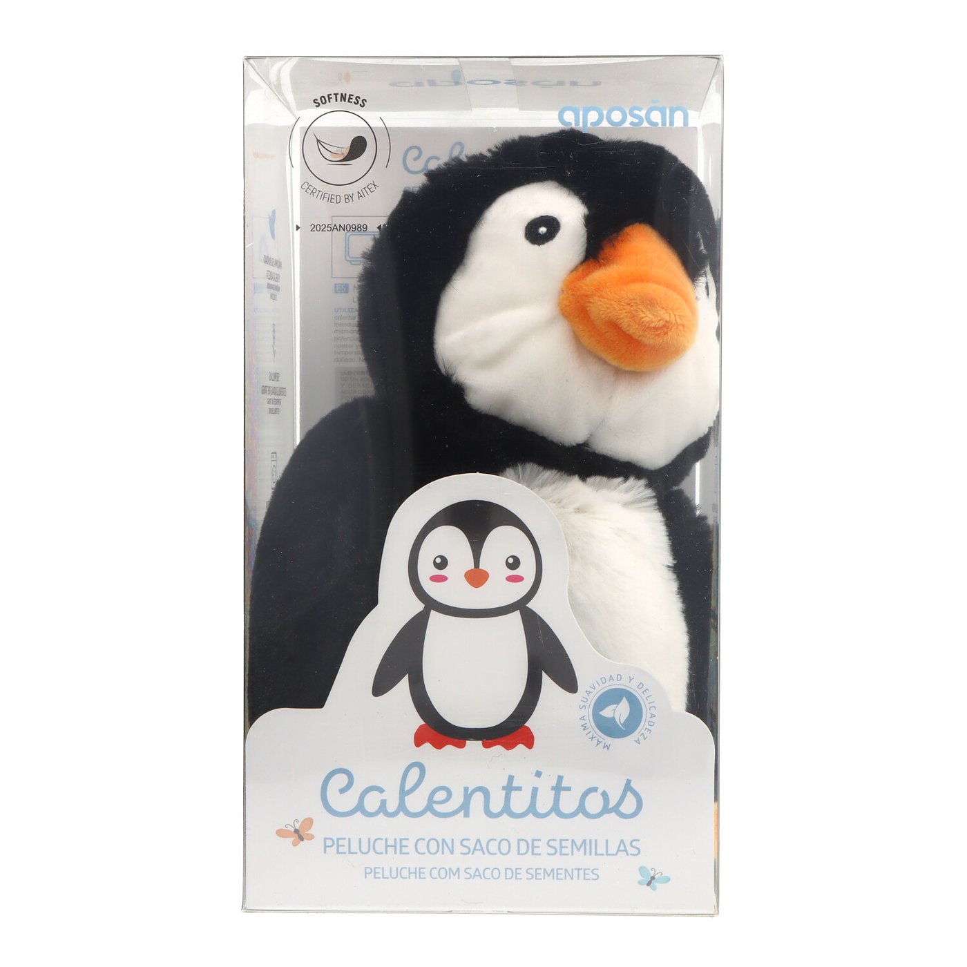 Brinquedo de pelúcia térmica "Pinguim" da linha Calentitos da marca, com saco interno de sementes para fornecer calor ou frio, referência 025719.