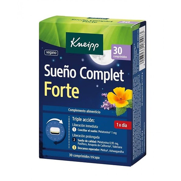 Kneipp Sueño Complet Forte é um suplemento alimentar desenvolvido para promover um sono natural e reparador através de uma fórmula de três camadas que atua sequencialmente ao longo da noite. Sua tripla ação ajuda você a adormecer rapidamente, a manter um sono tranquilo e, finalmente, a acordar revigorado e energizado.