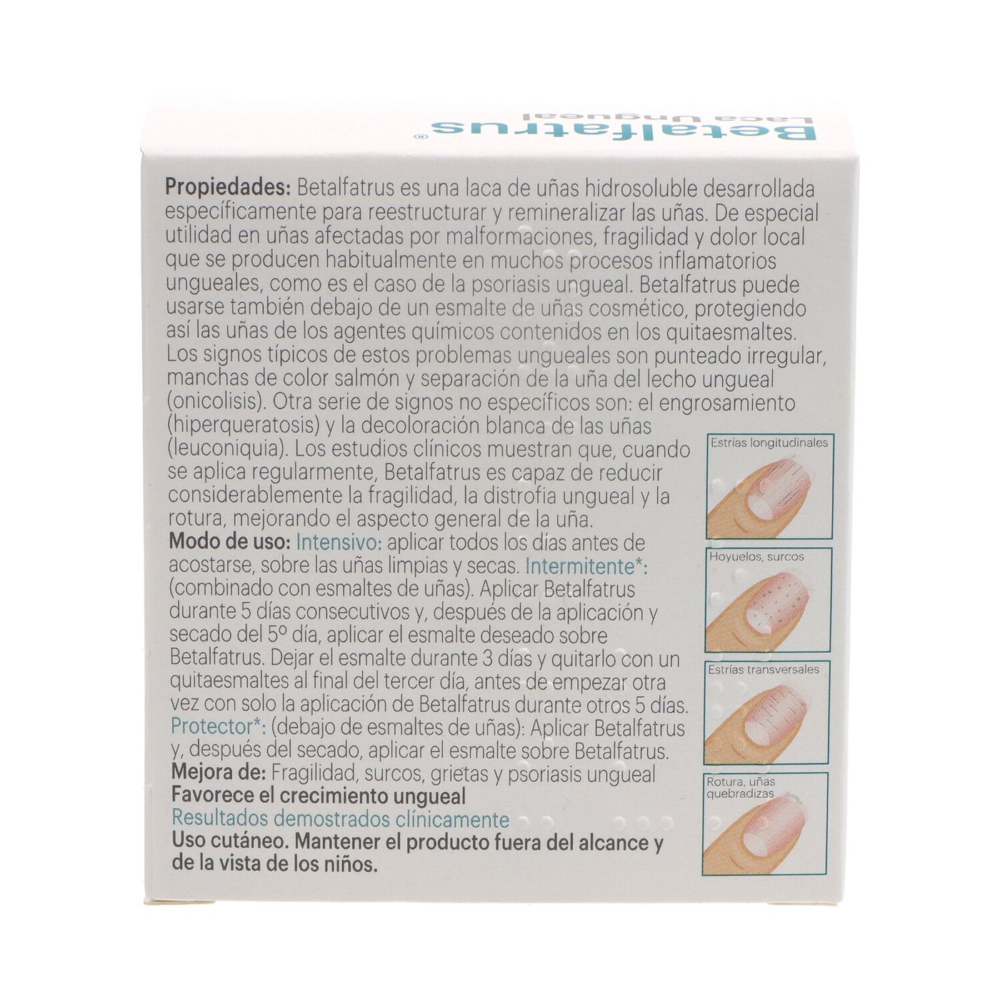 A formulação de Betalfatrus Nail Lacquer inclui uma poderosa combinação de ingredientes ativos. Seu principal componente é a hidroxipropilquitosana, um derivado da quitosana que possui excelentes propriedades hidratantes e reparadoras. Também contém aldeído metil glutaraldeído, que fortalece e endurece as unhas, reduzindo sua fragilidade.