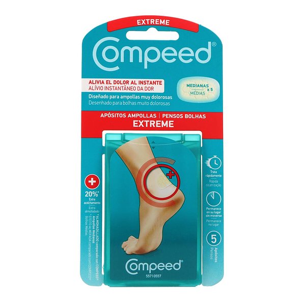 Compeed Blisters Extreme 5 U é um penso hidrocolóide altamente eficaz para o tratamento rápido e indolor de bolhas e úlceras.