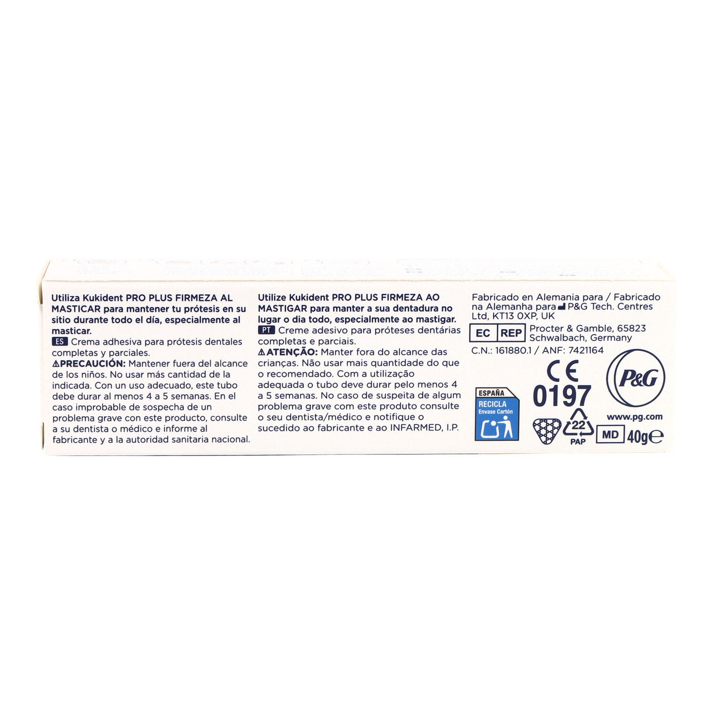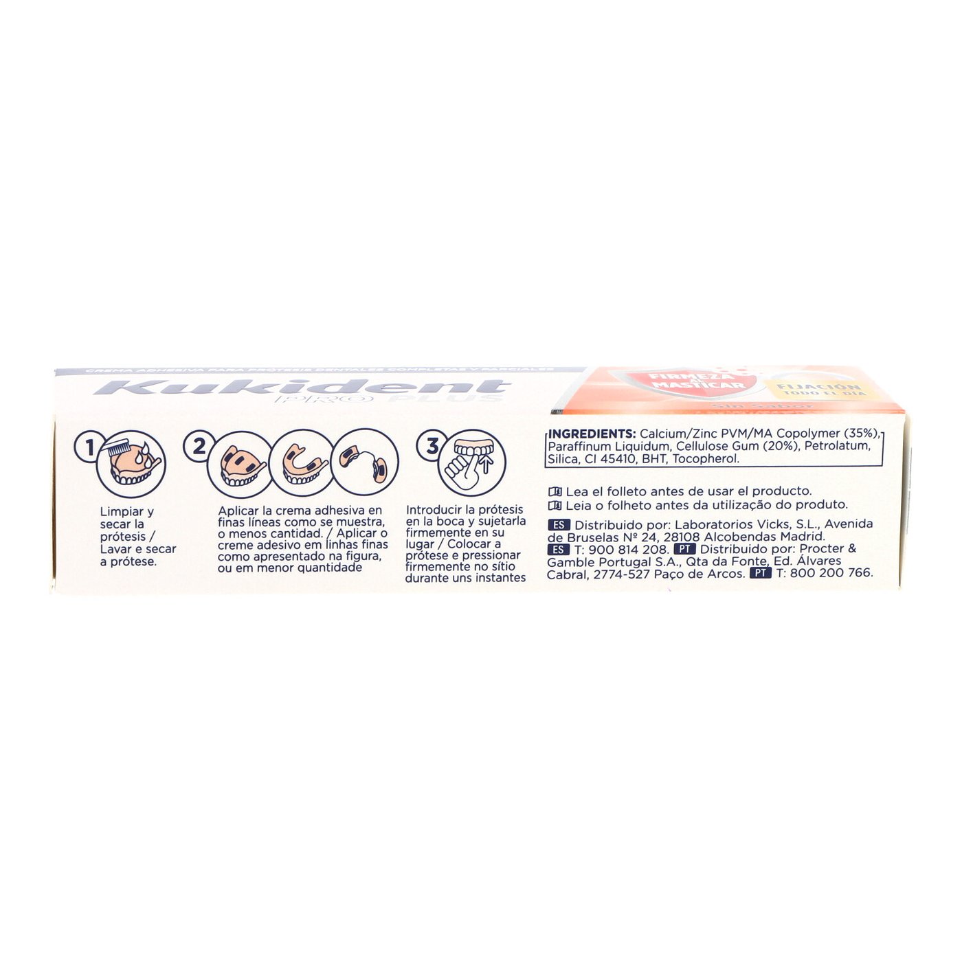 A lista de ingredientes é composta por Goma de Celulose, Paraffinum Liquidum e Petrolatum que compõem a fórmula Kukident Proplus. Esses componentes são conhecidos por prolongar a aderência e criar uma vedação segura ao redor da prótese.