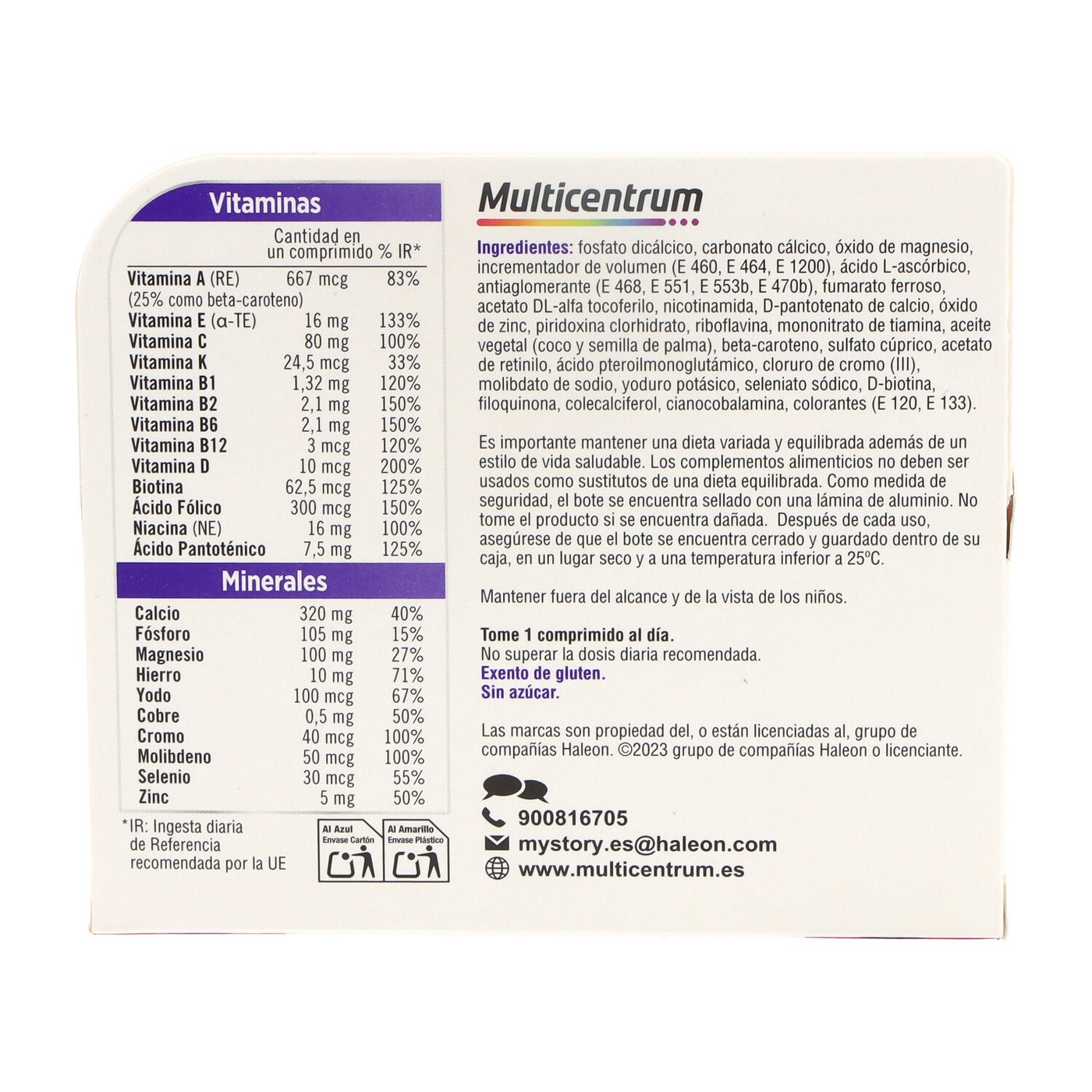 Cada comprimido Multicentrum Woman contém um equilíbrio perfeito de vitaminas e minerais, incluindo vitaminas (C, A, D, E, B1, B2, B6, B12, K, pantotenato de cálcio, biotina, ácido fólico, niacedamida), minerais ( Cálcio, Fósforo, Magnésio, Ferro, Zinco, Iodo, Cobre, Manganês, Cromo, Molibdênio, Selênio, Cloreto de Potássio) e outros nutrientes, como luteína.