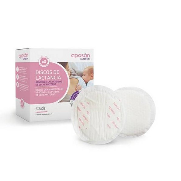Discos de Amamentação Aposan, 30 unidades (ref. 203766). Discos ultrafinos e extramacios com tripla camada absorvente e fita adesiva, projetados para a amamentação diária com o máximo conforto.