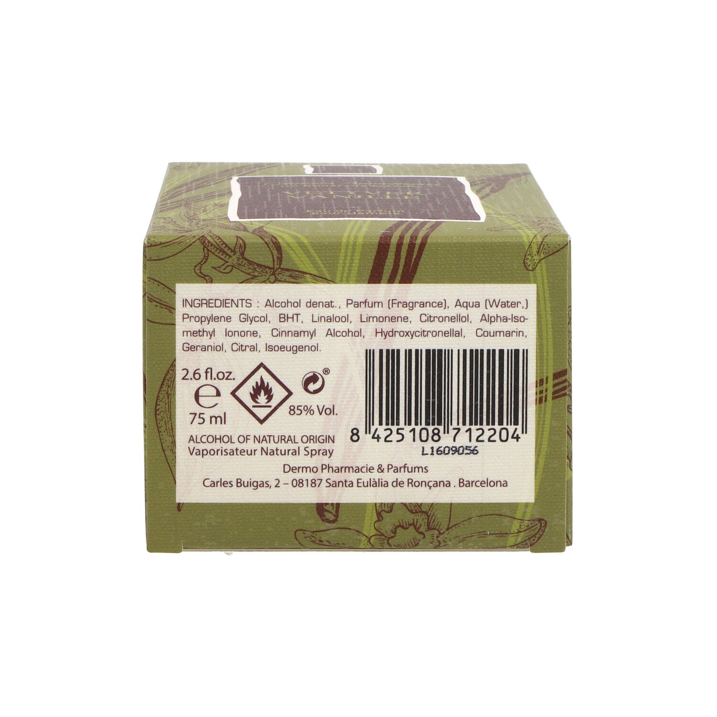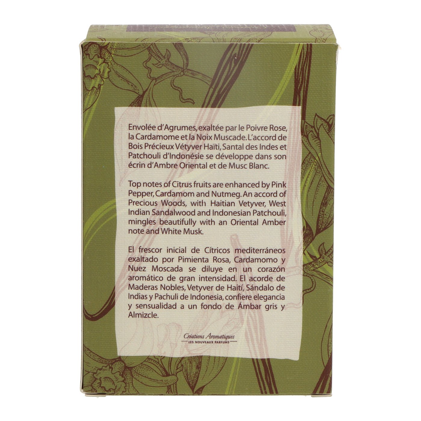 Cítricos, pimenta rosa, cardamomo, noz-moscada, vetiver haitiano, sândalo indiano, patchouli indonésio.