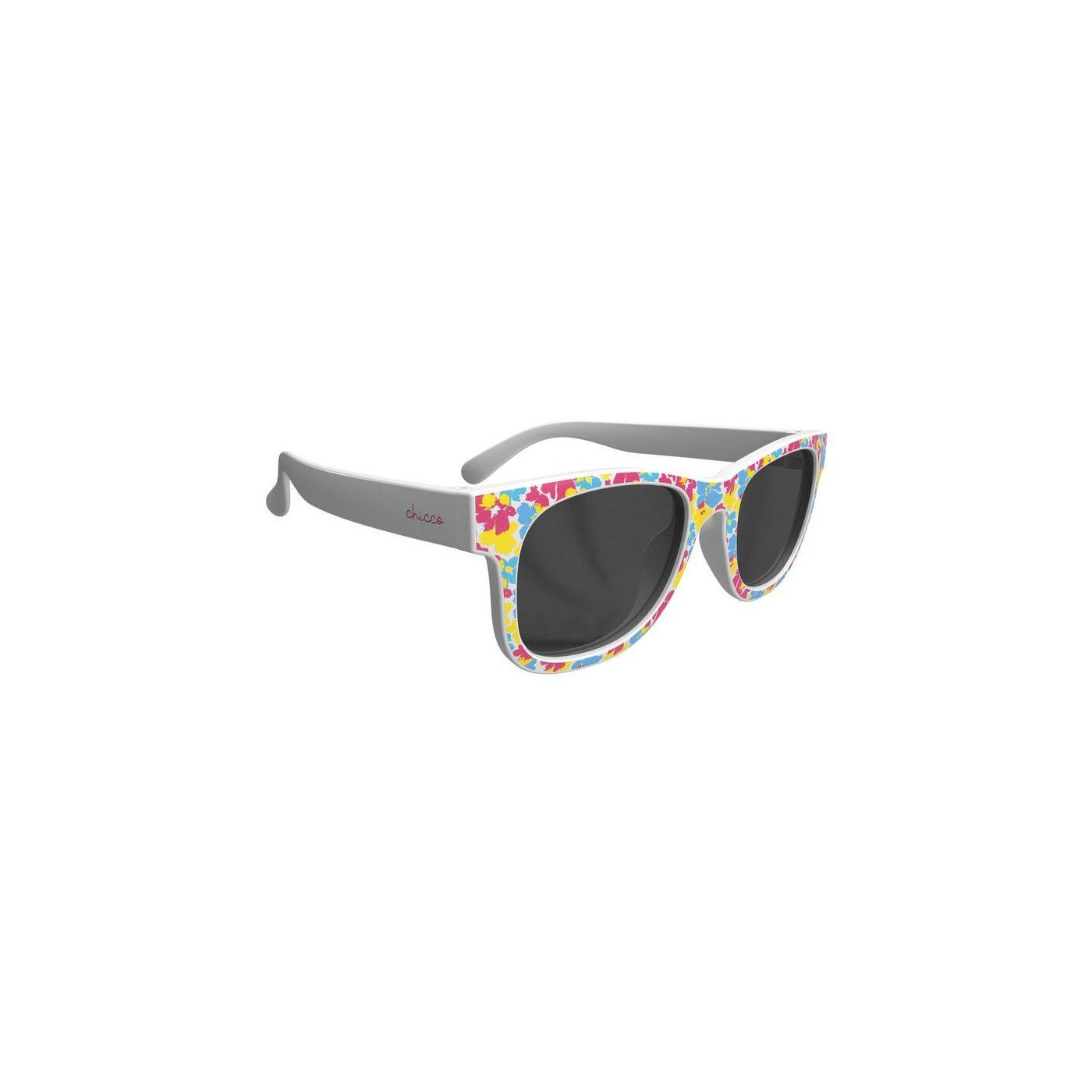 Óculos de sol Chicco para crianças maiores de 24 meses, com desenho de flores multicoloridas. Oferecem proteção UV e são confortáveis e resistentes.
